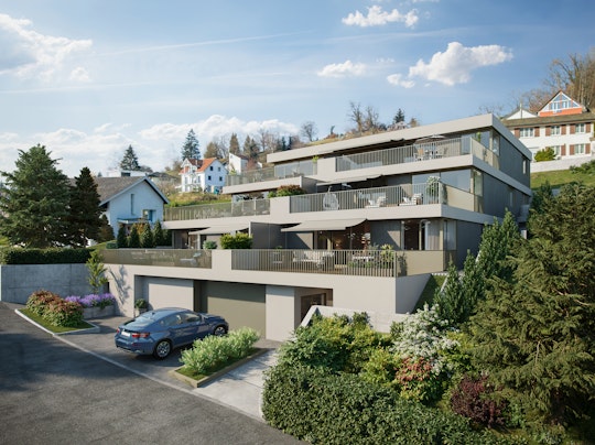 Die Anordnung der fünf Wohneinheiten als Terrassenhaus, welches sich sanft in den bestehenden Hang einbettet, nutzt alle Vorteile der einmaligen Aussichtslage aus.