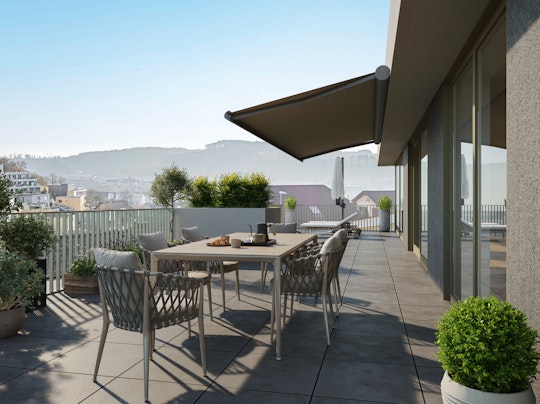 Hier geniessen Sie Sonne von morgens bis abends. Und können den Blick in die Weite bei einem gemütlichen Brunch am Sonntagmorgen oder bei einem Glas Wein mit Freunden schweifen lassen.